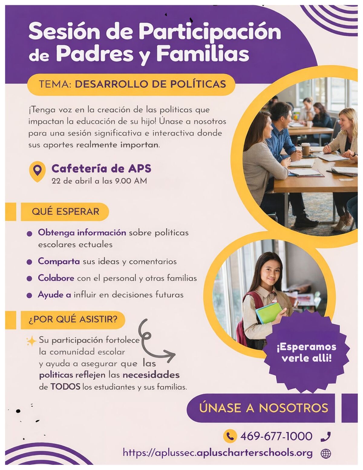 Join us for our Parent & Family Engagement Session on Wednesday, April 22 at 9:00 AM in the APS Cafeteria.